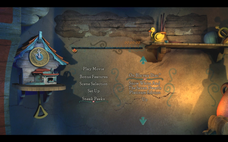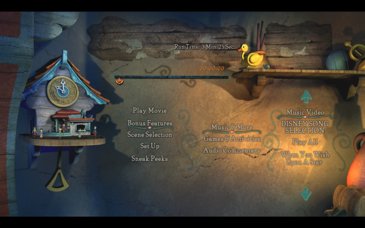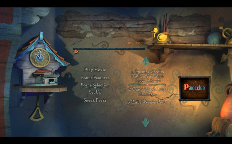 타이틀 화면은 요정과 지미니 크리켓의 간단한 애니메이션과 함께 제페토의 작업실을 보여줍니다.